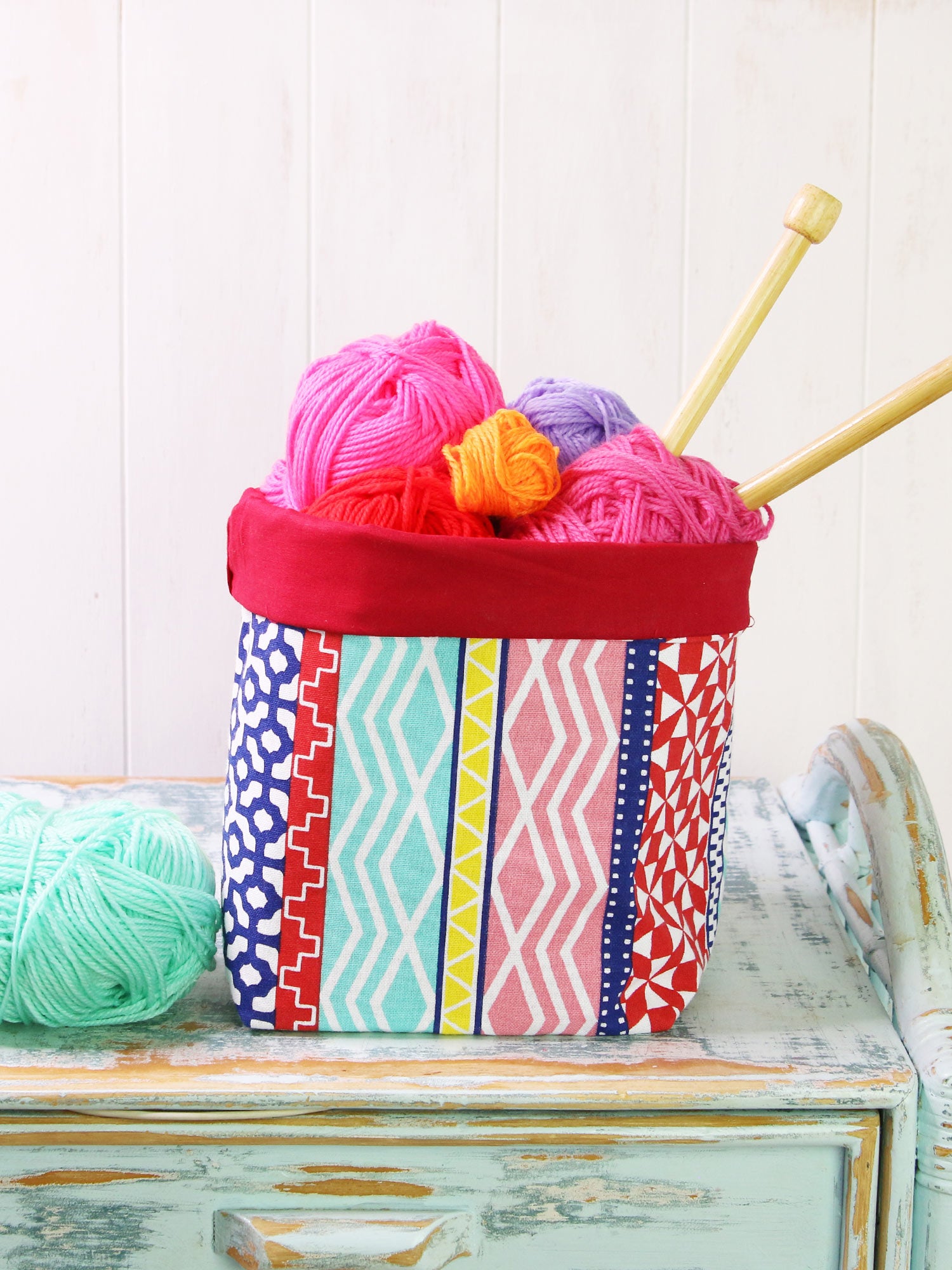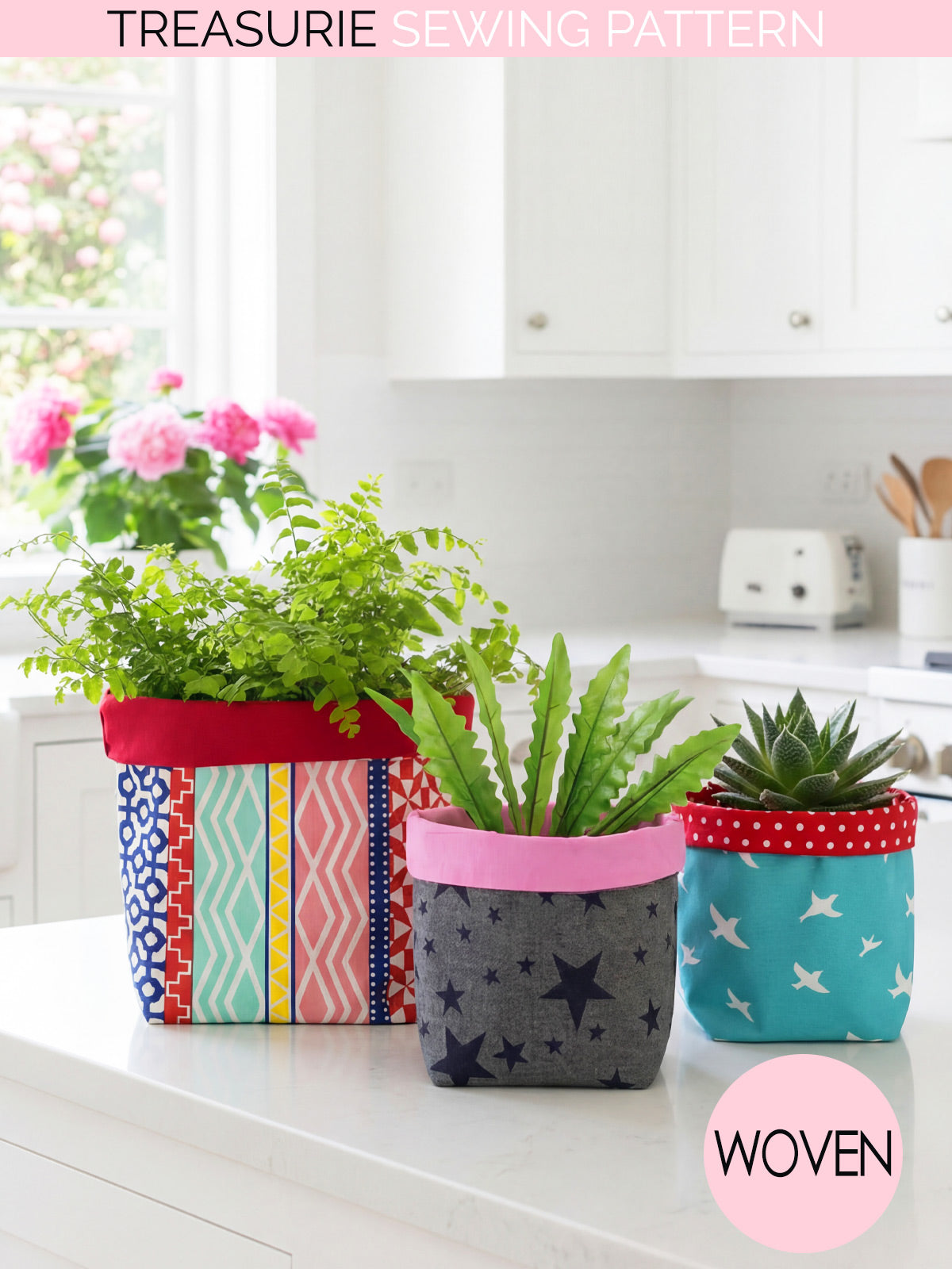 This beginner-friendly pattern includes five sizes ranging from small baskets to larger storage containers. With boxed corners and a folded top edge for added structure, these baskets are ideal for holding sewing supplies, toys, craft materials, or household items.