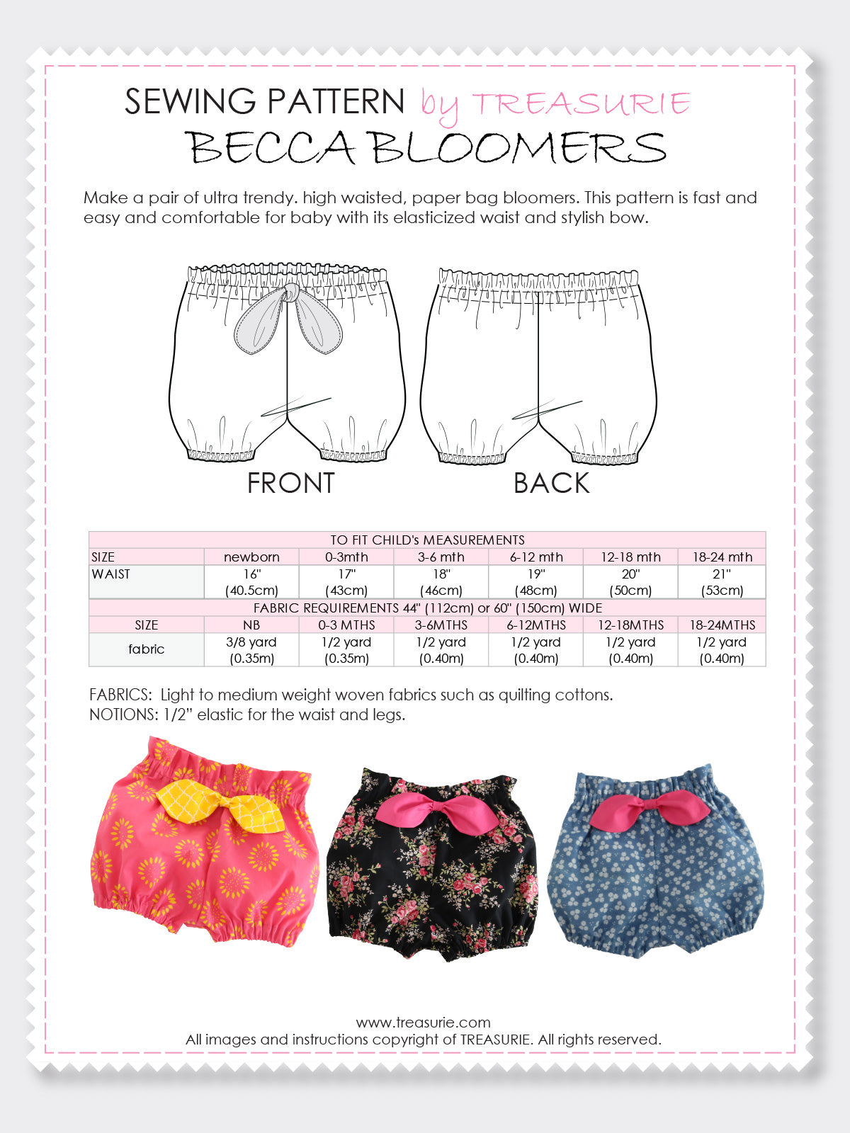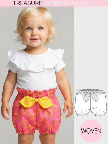 Designed for woven fabrics, these bloomers are fast and easy to sew, making them ideal for beginners. Add the optional bow for extra style, and pair them with tops, dresses, or sun tops for adorable everyday outfits.