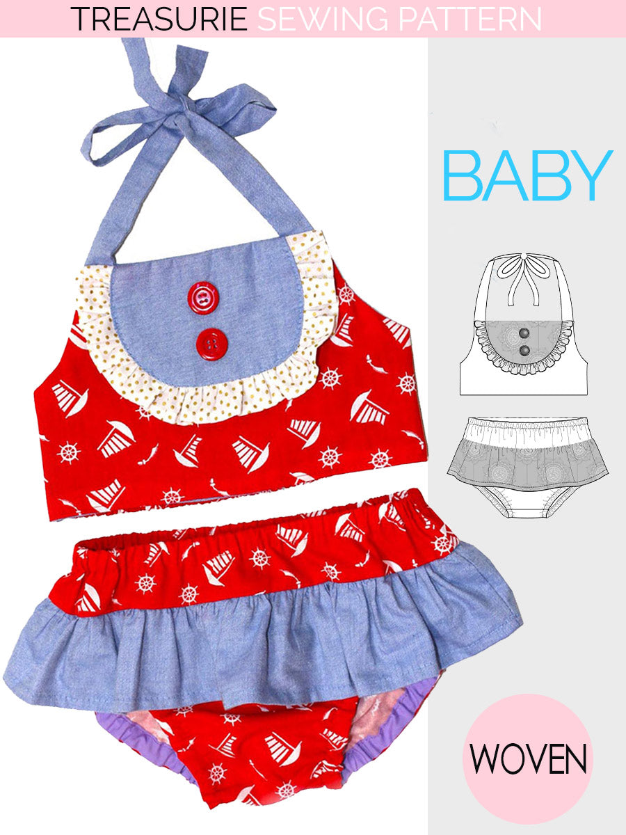 Sew adorable summer outfits with this baby swimsuit sewing pattern. The Birdie Bikini features a vintage-inspired baby bikini design with a halter neck top and matching bottoms, creating a stylish and comfortable outfit for warm weather.