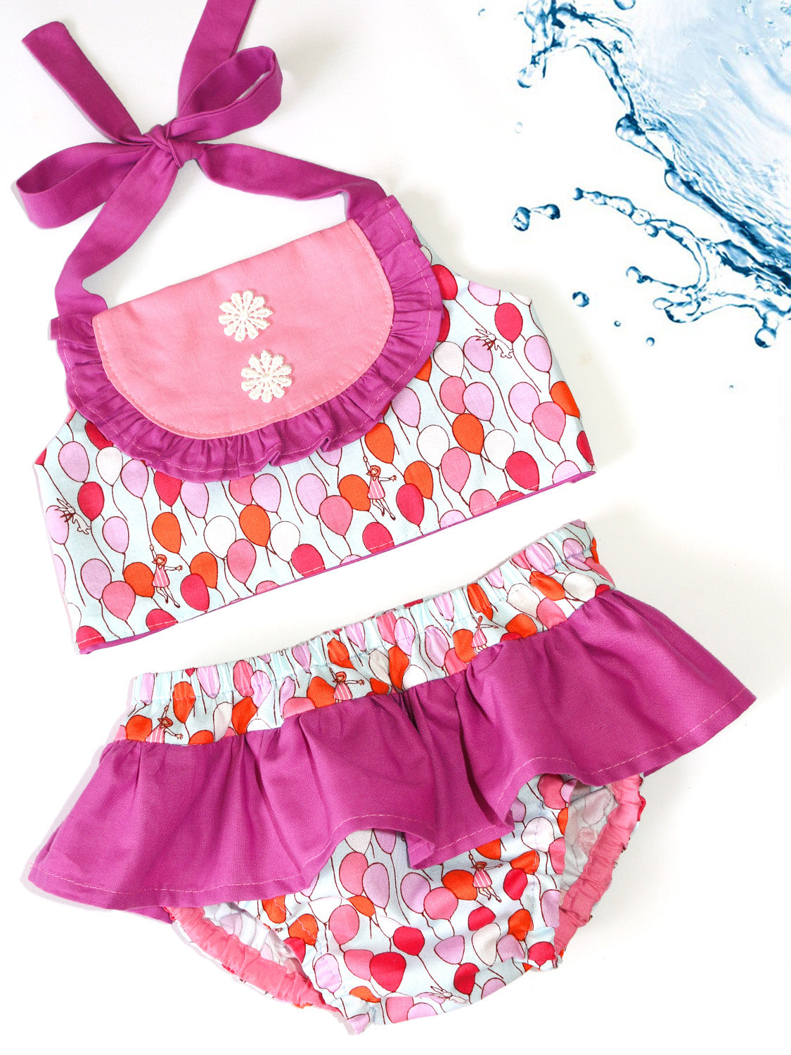 The halter top has adjustable ties and an elasticized back for a flexible and secure fit, while the bottoms include two sizing options to wear with or without a diaper. This makes the pattern both practical and versatile for babies and toddlers.