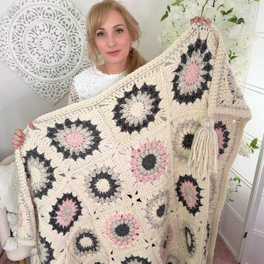 Create a cozy, modern crochet blanket with this Sunburst Granny Square Blanket Pattern from Treasurie. Made using classic sunburst granny squares and super bulky yarn, this design works up quickly and is perfect for beginners and confident crocheters alike.