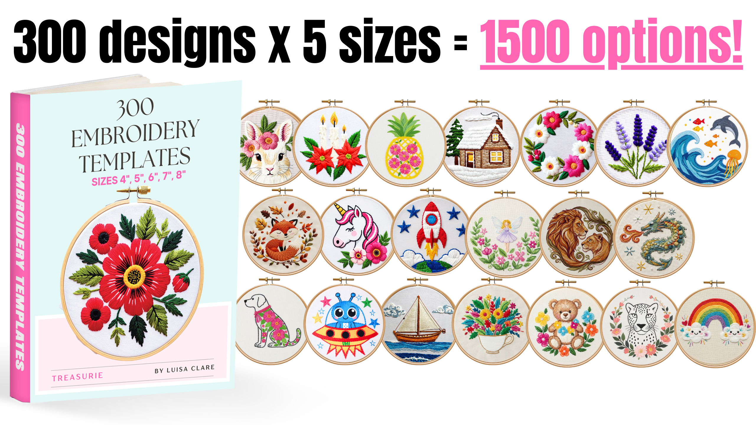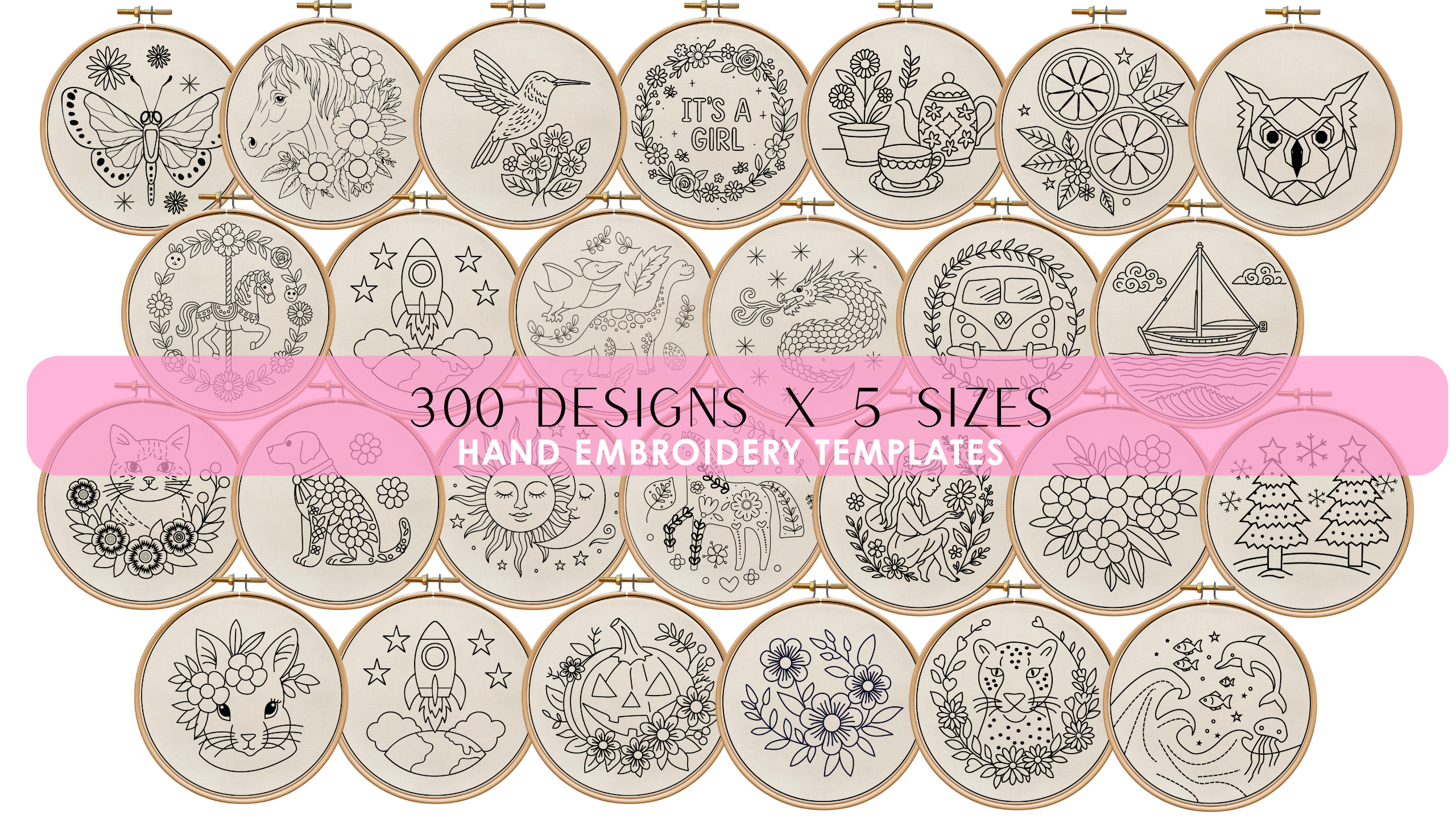 Inside, you’ll get 300 embroidery templates you can print and trace right onto fabric—no guessing, no drawing skills required.