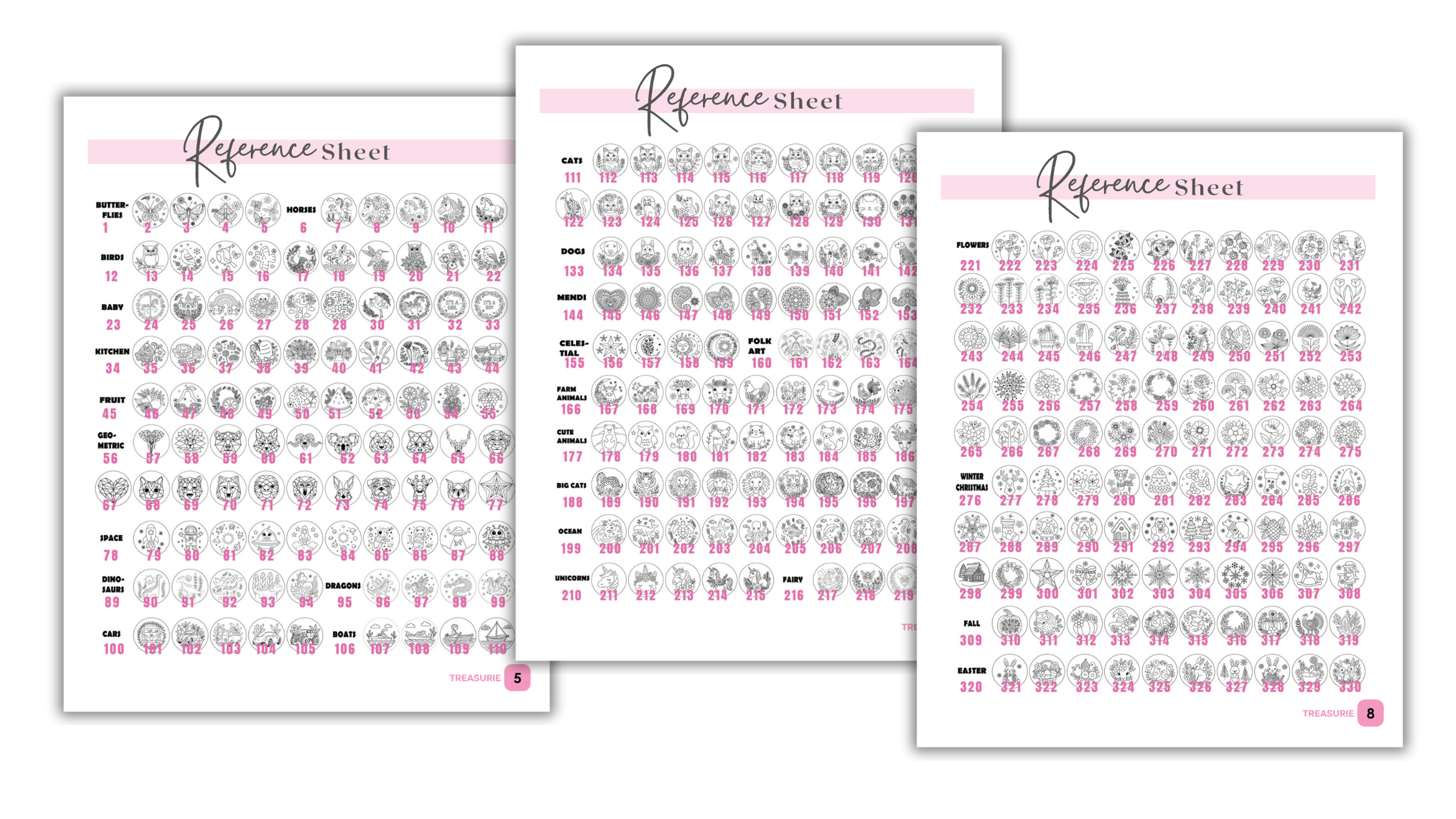 ✅ A mix of florals, animals, motifs, cats, dogs, dinoaurs, cars, boats, unicorns, horses, holiday, seasons, geometric, dragons and other decorative elements