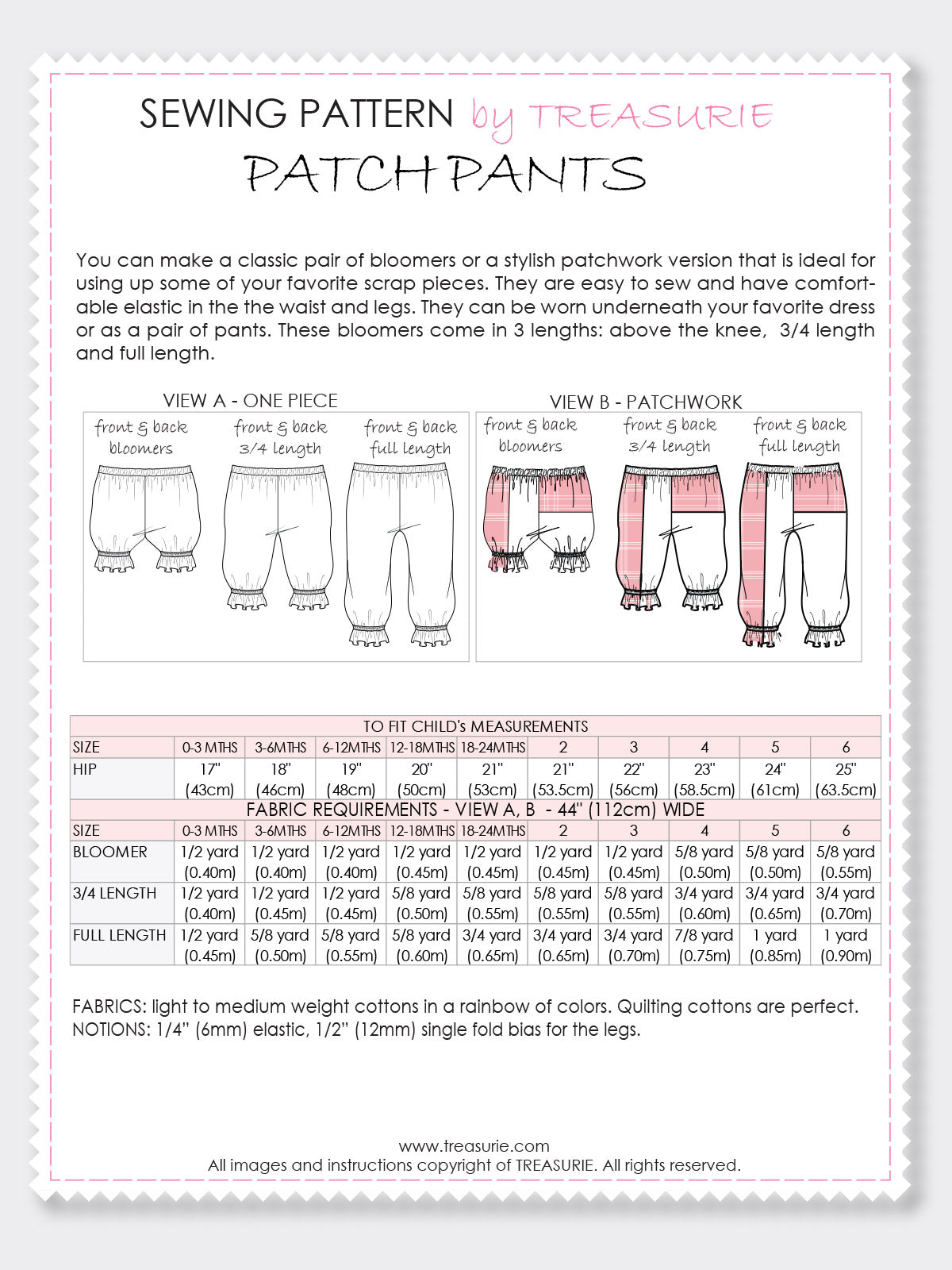 Sew practical and stylish handmade clothing with this patchwork baby pants sewing pattern. These versatile baby bloomers and pants can be made in a classic solid fabric or a patchwork design, making them perfect for using your favorite fabric scraps.