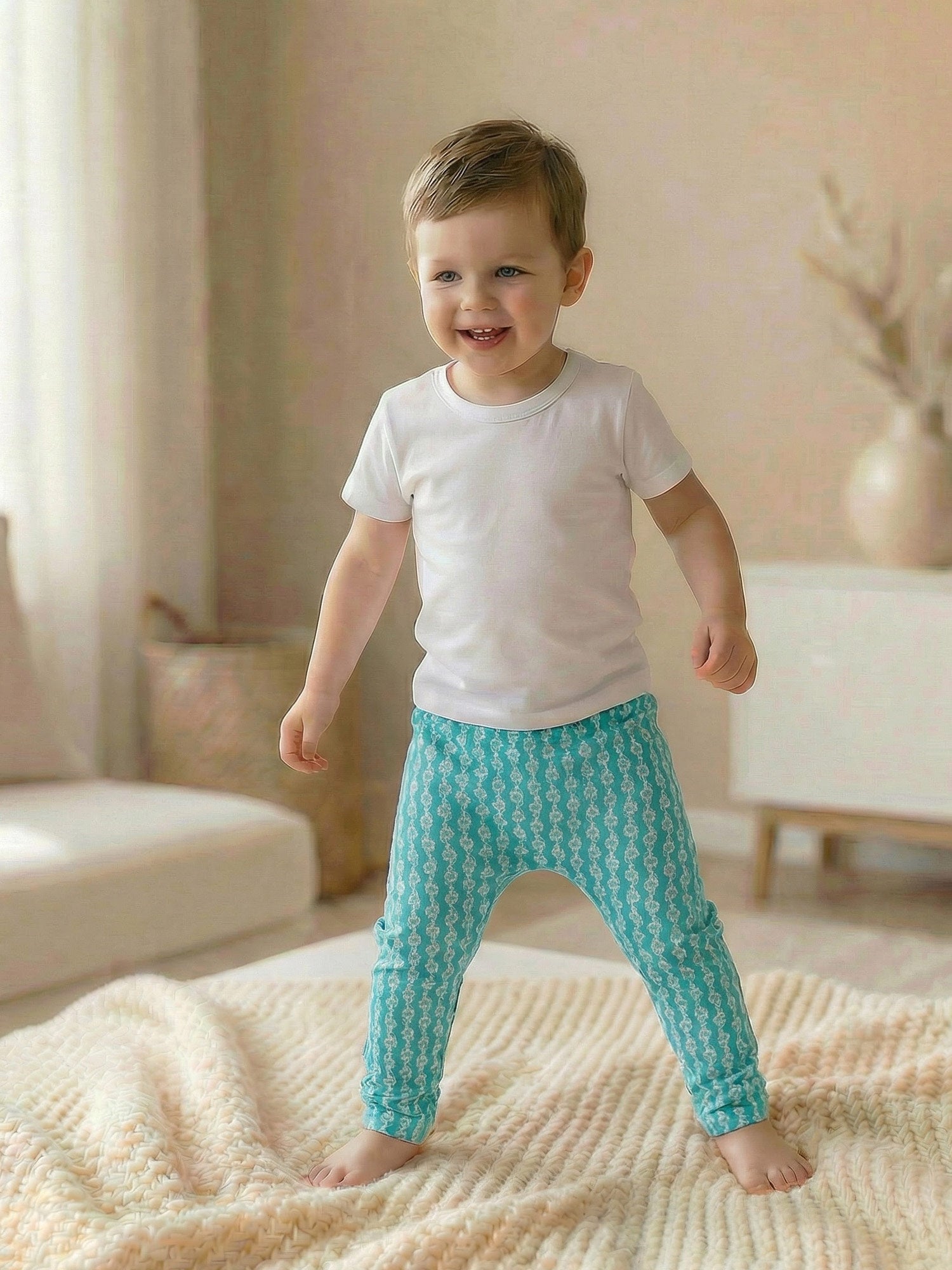 This baby harem pants sewing pattern allows you to create modern handmade clothing that is both practical and fashionable. The comfortable stretch fit allows freedom of movement, while the stylish slim harem shape creates a trendy look.