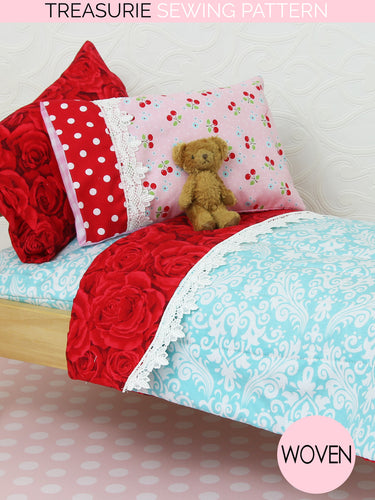 This 18 inch doll bedding pattern has four simple pieces for you to make. The doll’s mattress, the blanket, a pillow insert, and 2 styles of pillowcases. Teddy or Dolly will look really relaxed in their neat little bed. You will have great fun creating these bedding accessories while using up scraps from your fabric collection. Remember to add in a bedtime story – Goldilocks and the three bears is always a favorite!