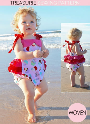 The Isabella Romper is a beautiful vintage styled baby romper with easy shoulder ties and 3 cute ruffles at the back. It is easy to make with no buttonholes or zippers. The Isabella romper is designed to have lots of room to accommodate either disposable or fabric diapers. With an elasticized back and legs it is easy and comfortable to wear and is perfect for the hot summer months. You will get compliments everywhere your baby goes in this outfit.