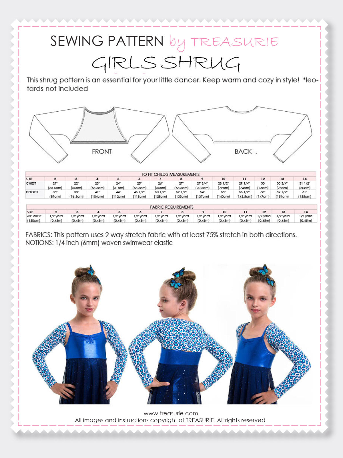 This shrug pattern is essential for your little dancer. Keep warm and cozy in style! (*leotards in photo not included)
